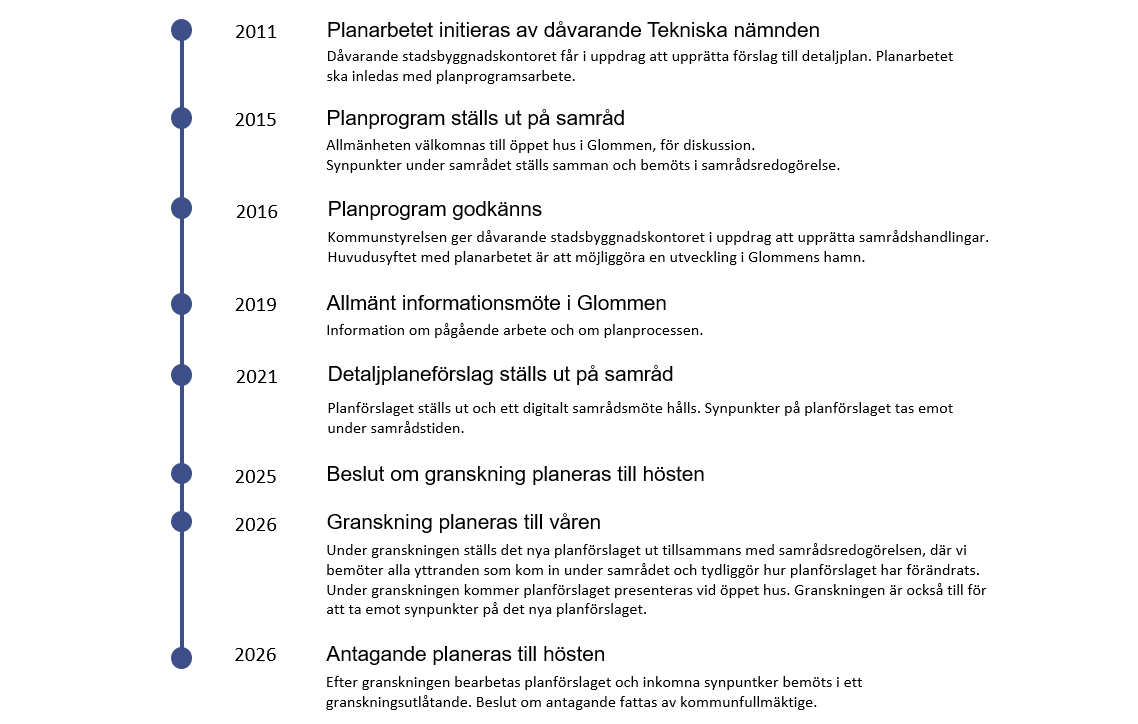 Glommens hamn är en tydlig samlingspunkt för såväl boende som besökare i Glommen. Under senare år har hamnens betydelse som renodlad fiskehamn minskat. Därför har kommunstyrelsen gett samhällsplaneringsavdelningen i uppdrag att se över hur detaljplanen för hamnområdet kan utvecklas. Detaljplanen ska ge möjligheter till en mer flexibel användning av hamnområdet för att kunna förverkliga idéer som tidigare inte har varit möjliga.