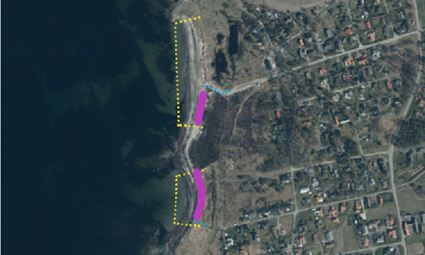 Tång rensas i det lila området (södra stranden), övrig strand lämnas orörd (norra stranden).