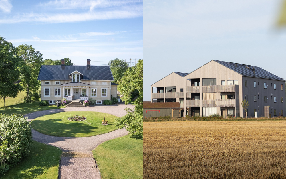 På bilden är Bobergs gård, vinnare av arkitekturpriset "God byggnadsvård" (foto: Majvi Johansson, Husfoto) & Skrea Gårdar, vinnare av arkitekturpriset "nyproduktion". Foto: Fredblad Arkitekter.