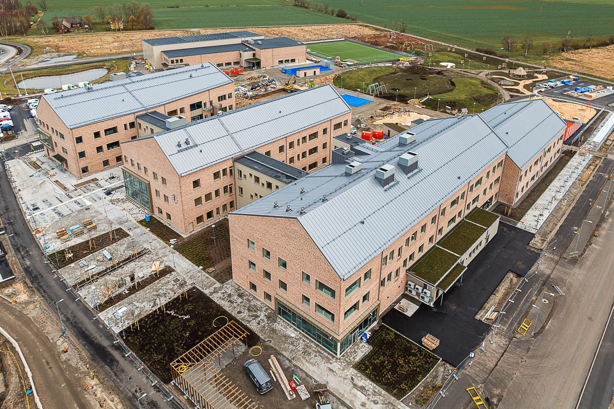 Tröingeskolan under byggnation. I bakgrunden är idrottshall och konstgräsplan.