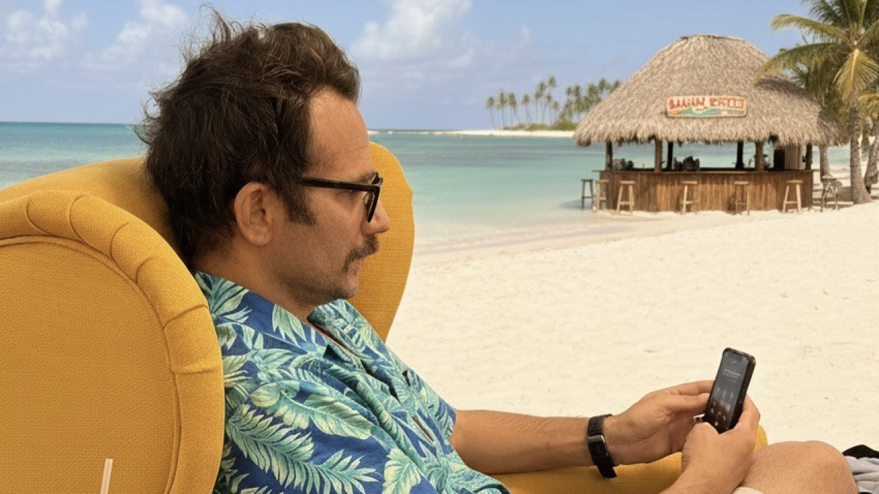 Näringslivsutvecklaren Paul Klinteby på en artificiell strand, redo att inspirera.