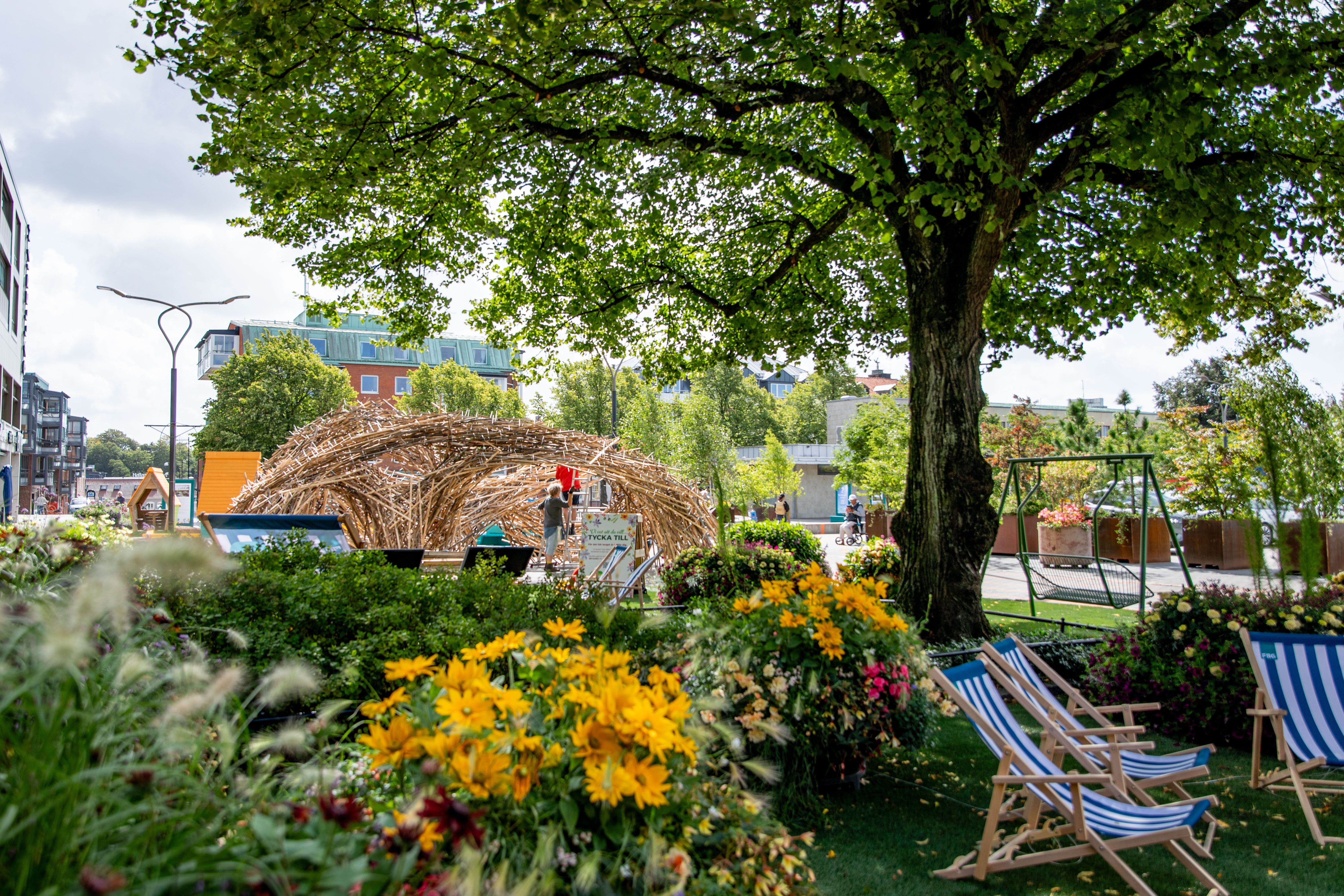 Under augusti och september 2025 förvandlades en del av Stortorget till Sommartorg. Foto: Destination Falkenberg.