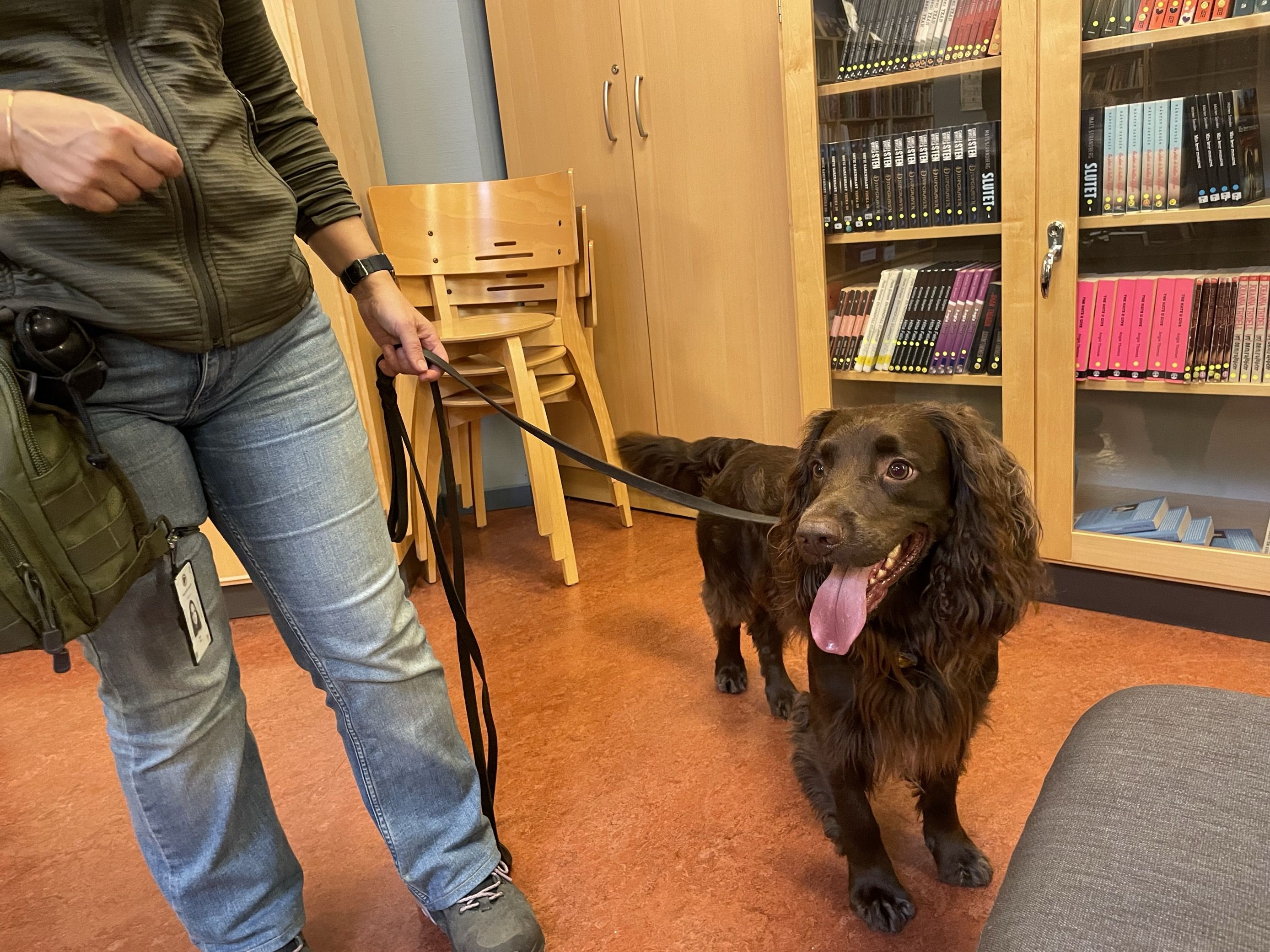 Frank Nordquist nosar sig igenom skolbiblioteket på Skogstorpsskolan i jakt på narkotika. Bilden är från hösten 2024. Bild: Falkenbergs kommun.