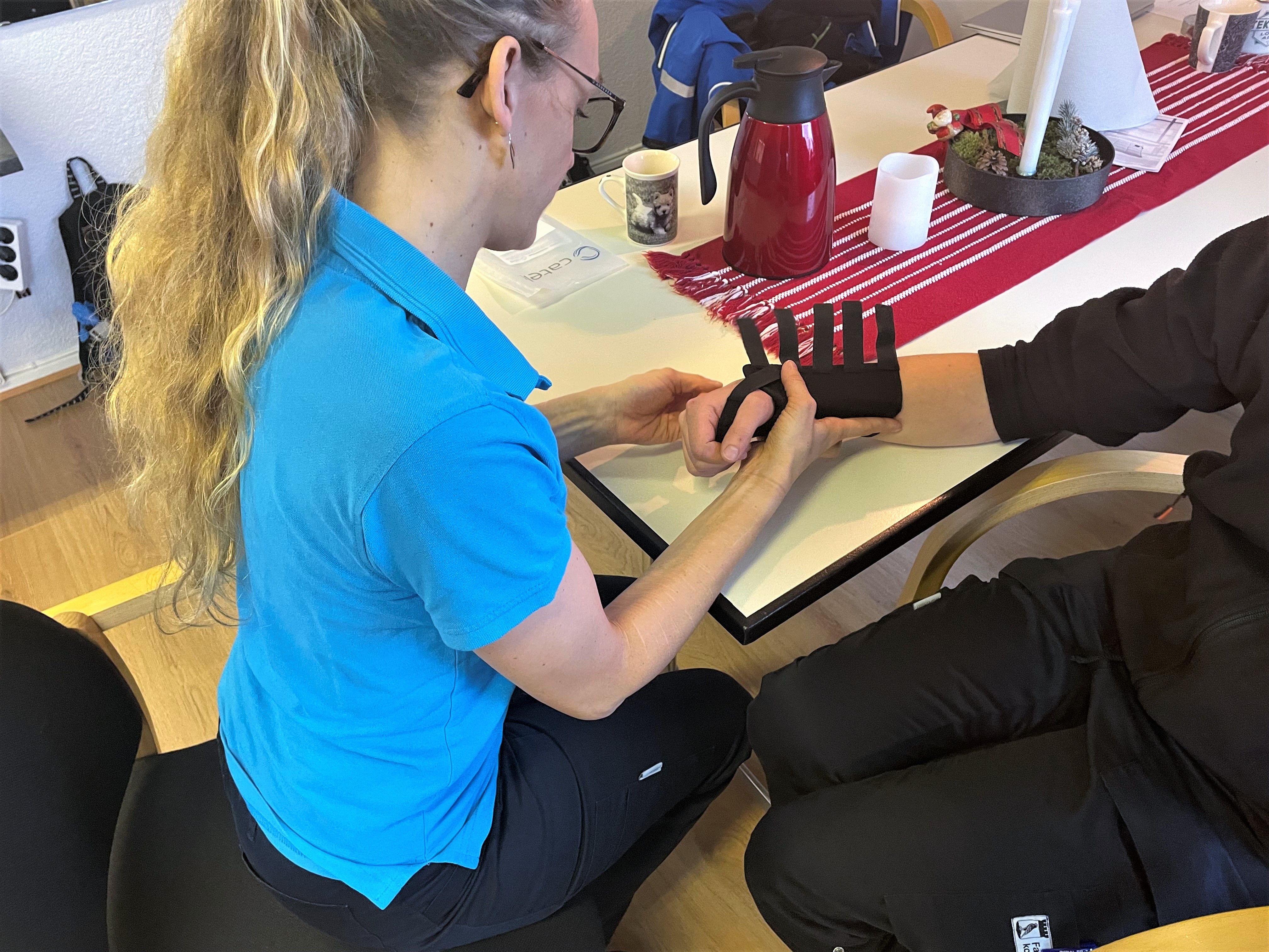 Här ser vi Isabel prova ut ett handledsstöd, vilket kan underlätta för personer med exempelvis mycket smärta i handleden.
