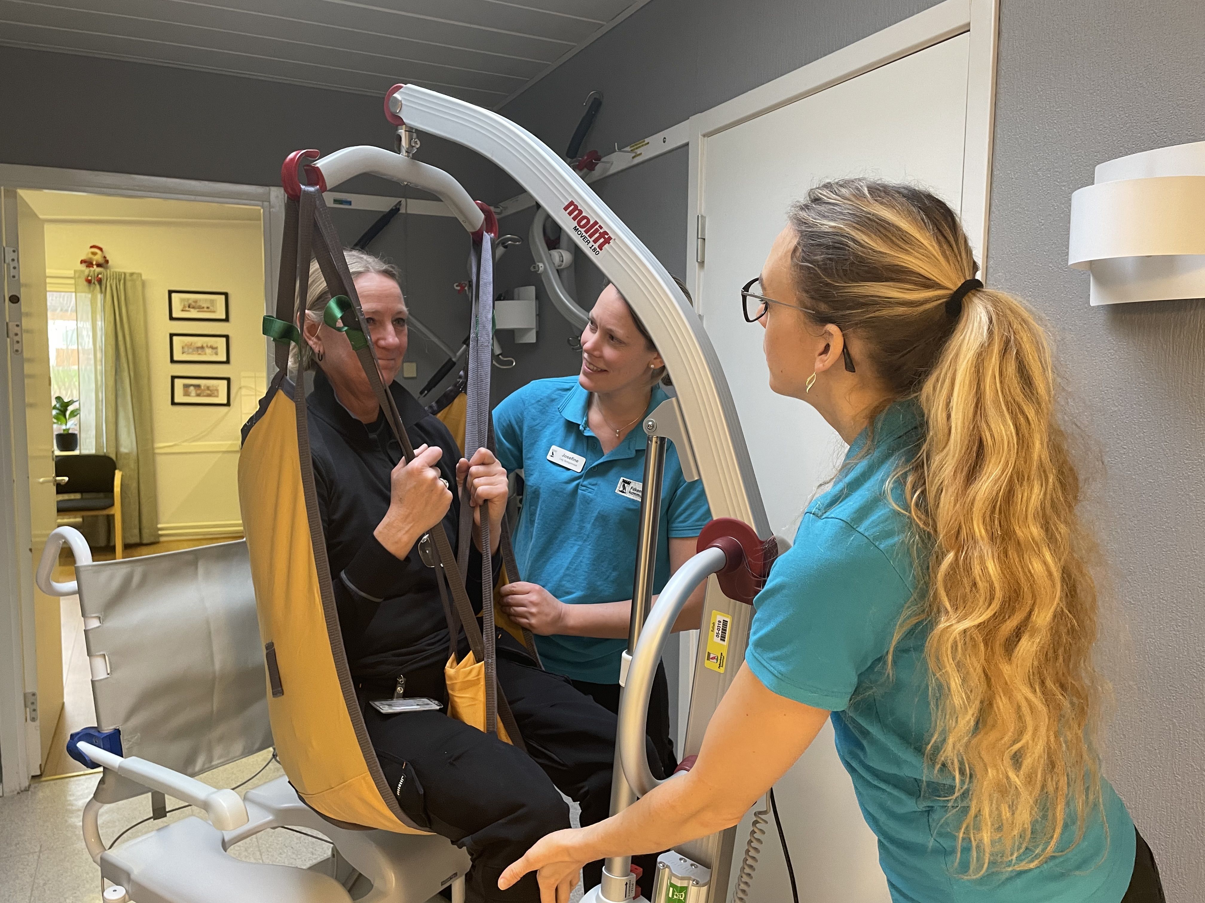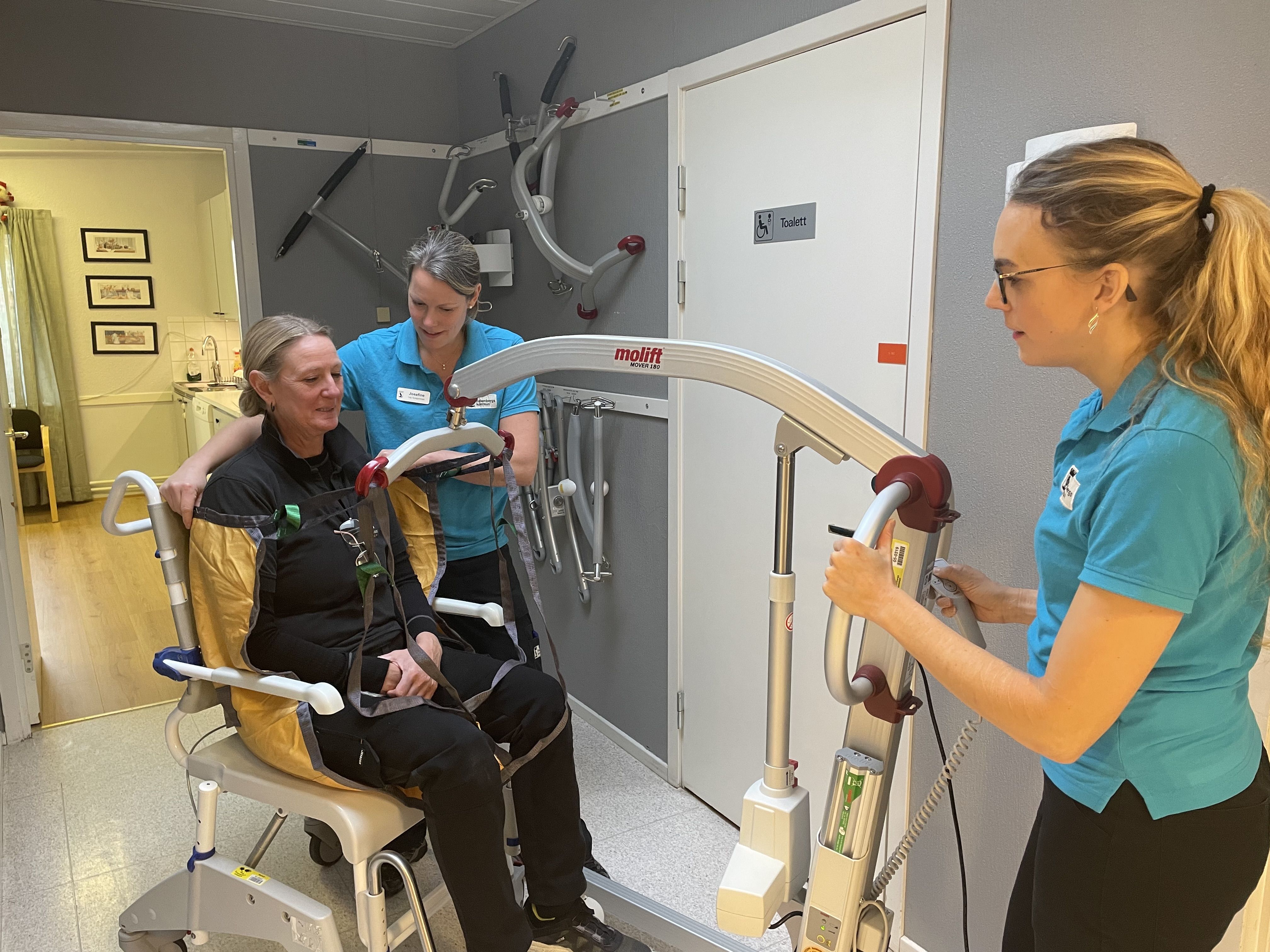 Att prova ut hjälpmedel som lyftsele är en del av arbetsterapeuten och fysioterapeutens arbete inom äldrevården. Lyft och lyftsele kan hjälpa de patienter som inte klarar att stå på sina ben och behöver hjälp med förflyttning. Här ser vi Josefine och Isabel demonstrera hur ett lyft kan gå till med hjälpmedelsteknikern Ulrika Svensson i rollen som patient.